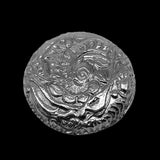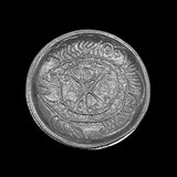 The Don Drumm Plate with Greek Monogram features a number of popular Christograms. A fish adorns the plate surface, as a "Chi-Rho" appears in the center (The Chi-Rho is formed by combining the first two Greek letters of the spell of "Christ"). The Greek letters "Alpha" and "Omega" also appear, symbolizing the "beginning and the end".