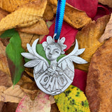 An angel cradles the name of Leandra's home state of "Ohio", with a leaf from Ohio's official tree, the Buckeye.
