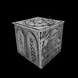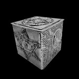 One specific design element you’ll find in each box is the interior base tile. In this pewter box, the interior, central, base consists of an abstract pattern with wavy lines that have short, perpendicular lines on top of them. Periodically throughout the design are circles. On the first exterior side of this box is another Star of David. It is designed from multiple thin lines and has circular dots interspersed throughout this design. For the second side, there is a background design of lines placed on the horizontal and then a thick circle is superimposed on top of the background. For the third side, there is a representation of the Ten Statements. For the final side of this box, there is an abstract design with vertical, shallow grooves with a thin circle superimposed on top of this background.