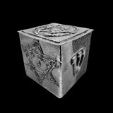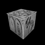 One specific design element you’ll find in each box is the interior base tile. In this pewter box, the interior, central, base consists of a lightly textured abstract design. On the first exterior side of this box is another Star of David. It is designed from multiple thin lines and has circular dots interspersed throughout this design. On the following side, is the 21st letter in the Hebrew alphabet, “shin.” It is the first letter in the name of God (Shaddai) which translates to “Almighty.” However, this letter can have different meanings. For the third side, there is a representation of the Ten Statements. On the final side of this box is the Hebrew word for "life."