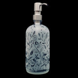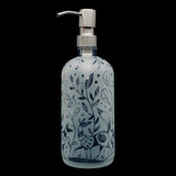 Glass pump bottle etched with Leandra's original designs for hand sanitizer or liquid soap.