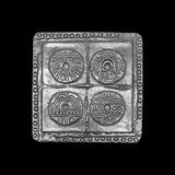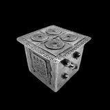 One specific design element you’ll find in each box is the interior base tile. In this pewter box, the interior, central, base you will find abstract zig-zags, very reminiscent of early Don Drumm designs. The first side on the exterior consists of rectangles, a circle, and various shapes of rhombus. Each has different lines and shapes included in them and imbibes both visual and tactile interest. The next side has a small, bold, Don Drumm sun that is framed on two sides with a simple straight line. The other sides of the framing for this sun include thin, wavy lines and are punctuated with circles. Following this, you will find five small seashells placed as if they were the “five” side of dice. For the last side, the design starts with a miniature version that is similar to many of Don’s larger abstract pieces.