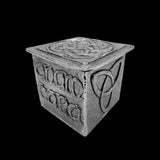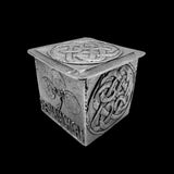 One specific design element you’ll find in each box is the interior base tile. In this pewter box, the interior, central, base consists of an abstract design with an oval and various lines. The first exterior side has a design of a triquetra. From a Christian perspective, this represents the “trinity.” For those with a pagan, Celtic tradition this design symbolizes the interconnectedness of the life cycle. On the second side, there is a design of a stylized, three-leaf clover. This side has the word “Beannachcai” which translates to “blessings.” The following side consists of a Celtic knot. And on the final side, the design is the Celtic phrase, “anam cara.” This translates to “soul friend.” In the context of this, one can also say that it represents more of a “compassionate presence” through one’s journey in spiritual growth.