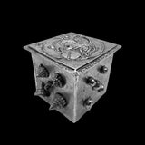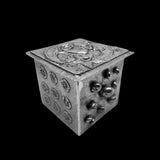 One specific design element you’ll find in each box is the interior base tile. In this pewter box, the interior, central, base consists of a design with sixteen circular shapes. Each with an open center and a textured border. For the first exterior side, there are nine organic circular shapes in this design. This is followed by the second side’s design of ten sea shells facing and oriented in various configurations. On the third side, there are five sea shells that are highly textured. For the final side, there are five sea shells, with a smooth textured design for their shells.