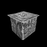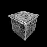 One specific design element you’ll find in each box is the interior base tile. In this pewter box, the interior, central, base consists of a design that has a circle superimposed on a background of thinly spaced lines. For the first slide, there is a motif from the inner base tile used again here. Deeper, more intense wavy lines are the background on this design. A thicker edged circle is superimposed against this background here too. For the second side, there is a bird with outstretched wings. It is positioned in the design, flying downward. At its head, there is a circular design as well. This is followed by the third side, also bringing circles to the forefront. A half circle that is highly textured is on the right. On the left side, are ten circles that are side by side, separated by a thin line. For the final side, the message “Art is a Labor of Love,” can be found.