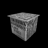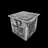 One specific design element you’ll find in each box is the interior base tile. In this pewter box, the interior, central, base of a modest circle is split with three elongated rectangular pieces. At the base of the first exterior side, is a half-circle design that can be seen to represent the sun with its rays. Above this are two columns of circles that complete this abstract design. The second side has a version of Rho and a cross. Following this, the third side has a highly textured circle with an abstract “X” across the circle design. The final side has the phrase “Be still and know that I am.” (Psalm 46:10)