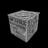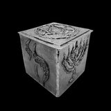 One specific design element you’ll find in each box is the interior base tile. In this pewter box, the interior, central, base consists of an abstract design of striations. For the first exterior side, you will find the phrase, “Be still and know that I am.” (Psalm 46:10) This is followed by a design depicting the Burning Bush. The third side of this box is the Hebrew word for "life." Following this, on the final side, the design depicts a seven-branched menorah that is lit.