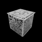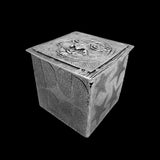 One specific design element you’ll find in each box is the interior base tile. In this pewter box, the interior, central, base consists of four stars. Each slightly different from each other. On the first side of this box you will see a lightly imprinted realistically looking flower. Sitting on top of this flower design is a flying insect of pewter that is approximately ¼ inch in thickness and has sharp details. On the next side, there is a cold-blooded friend crafted in pewter caught in mid-crawl. The texture of this side is apparently helping this visitor climb up the box. Keeping with the theme of nature, the following side has a design of a leaf with a friend resting upon it. On the last side, again, a cold-blooded creature - perhaps a small, pewter lizard can be found resting.