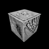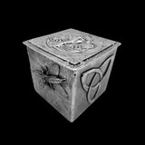 One specific design element you’ll find in each box is the interior base tile. In this pewter box, the interior, central, base consists of a mixture of geometric shapes. On the far left is a series of rectangles, followed by an oval. On the far right of this tile, is a design of circles. From the first exterior tile, you will see a fancifully designed insect sitting atop a leaf. The next tile has the design of a Celtic knot. This tile is followed up with the design of a cold-blooded creature crawling up the side of the box. And lastly, the box has an abstract design as its final side.