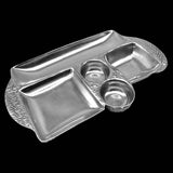 This multi-sectioned platter has 2 different sized square sections for charcuterie or snacks, 2 small round sections for sauces or pickles, and 1 long section perfect for lining up crackers in a neat row. However you choose to use yours, it is sure to please the eyes with the classic Drumm design rim that curves out on either end to form decorative handles.