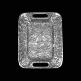 The Don Drumm Sun Platter with Handles features a classic Drumm sun face on the plate surface, as well as a second sun face on the reverse side. Each is surrounded by swirling, intricately detailed sun rays and the handles make for easy carrying of whatever culinary treats you see fit to serve. A popular wedding or housewarming gift.