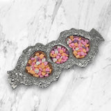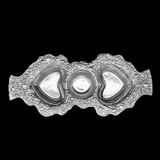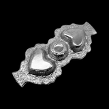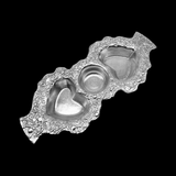 This platter features two heart shapes framing a small center round bowl, with a fancy abstract rim that finishes out into "handles" on either side. Makes a perfect wedding gift, for a special anniversary, or "just because."
