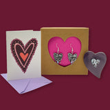 In this gift set, you'll receive a pair of earrings that are a collaboration between Don Drumm and Toni Billick, the gallery's aluminum manager. You'll also find a glass heart pendant created by Heidi Wojcik, designed to be worn either as a necklace or a pin. And last but not least, an artfully designed Valentine's Day card by Sam Fazio, perfectly color coordinated with the heart pin and earrings. (There are also some chocolate treats included in the gift box.)