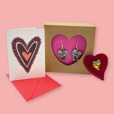 In this gift set, you'll receive a pair of earrings that are a collaboration between Don Drumm and Toni Billick, the gallery's aluminum manager. You'll also find a glass heart pendant created by Heidi Wojcik, designed to be worn either as a necklace or a pin. And last but not least, an artfully designed Valentine's Day card by Sam Fazio, perfectly color coordinated with the heart pin and earrings. (There are also some chocolate treats included in the gift box.)