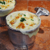This Don Drumm aluminum Onion Soup Bowl with Handle goes right from the oven to the dinner table. In the Drumm household, this is the favorite bowl for homemade chili, or make your best French onion soup! Order in multiples as a set or for individual servings, or arrange several together as a unique centerpiece with flowers or candles. There are 4 different handle designs to mix and match--choose styles from pulldown menu below. Please call the Gallery 330.253.6268 to order larger quantities.