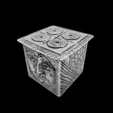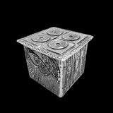 One specific design element you’ll find in each box is the interior base tile. In this pewter box, the interior, central, base you will find a design of shallow circles on one side separated from the other side by wavy lines. The first side is adorned with a series of lines in different lengths that take up the half of the shape. From the top of this side, there is a large circle that has smaller circles that fill it. For the next side, you’ll see a bird with outstretched wings that touch near the bird’s head and form a general circle shape. This is followed by a side of wavy, abstract lines that have concave and convex circles intersecting the lines.The final side is a traditional Don Drumm sun face.