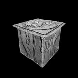 One specific design element you’ll find in each box is the interior base tile. In this pewter box, the interior, central, base consists of a design that has a background of multiple lines with circles imprinted on top of them. For the first side, there is an abstract design very similar to Don’s large scale brutalist work of many decades ago. You will see angular shapes paired with smooth, rounded designs with a background with minimal texture. Following this, the next side has vertical, wavy lines punctuated by dots. Again, a minimal texture on the background so that the foreground takes precedence. On the third side, there is a large round partial circle with a light texture. To its left, there are bold, vertical, lines that curve and have perpendicular lines as their texture. Lastly, the fourth side has abstract lines with a textured background.