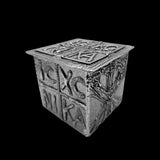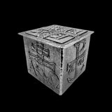 One specific design element you’ll find in each box is the interior base tile. In this pewter box, the interior, central, base consists of an abstract design with ropey, curving lines over a lightly textured base. There is a circle that stands out against the background. The first exterior side, of this design consists of an Orthodox Cross and the symbols Alpha and Omega. On the second side, there is a Rho with a cross. For the third side, there is a more minimal version of the lid tile. This pewter box finishes its design with a Rho and a Chi symbol. This Rho-Chi symbol is one of the earliest Christian monograms.