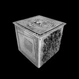 One specific design element you’ll find in each box is the interior base tile. In this pewter box, the interior, central, base consists of an organically formed flat spiral. On the first exterior side, this box has a series of slightly askew squares. Moving along to the second side of this box, you will find a design of flowers gone to seed for the winter. This side has quite a bit of texture that helps bring out the design. On the next side, there are six vertical rows of lightly textured rounded triangles. For the final side, you’ll find a design with two larger circles with horizontal bands. Atop of this design are vertical wavy elements that suggest motion.